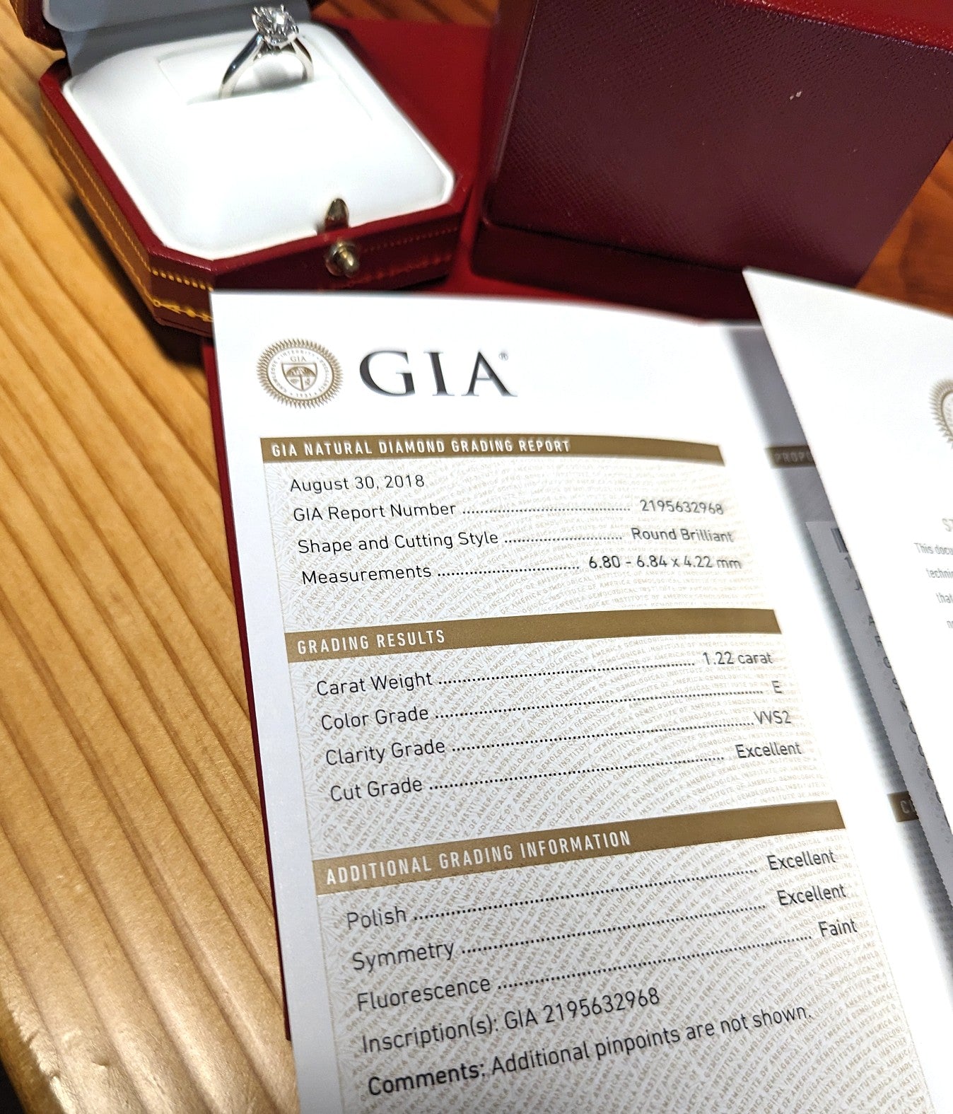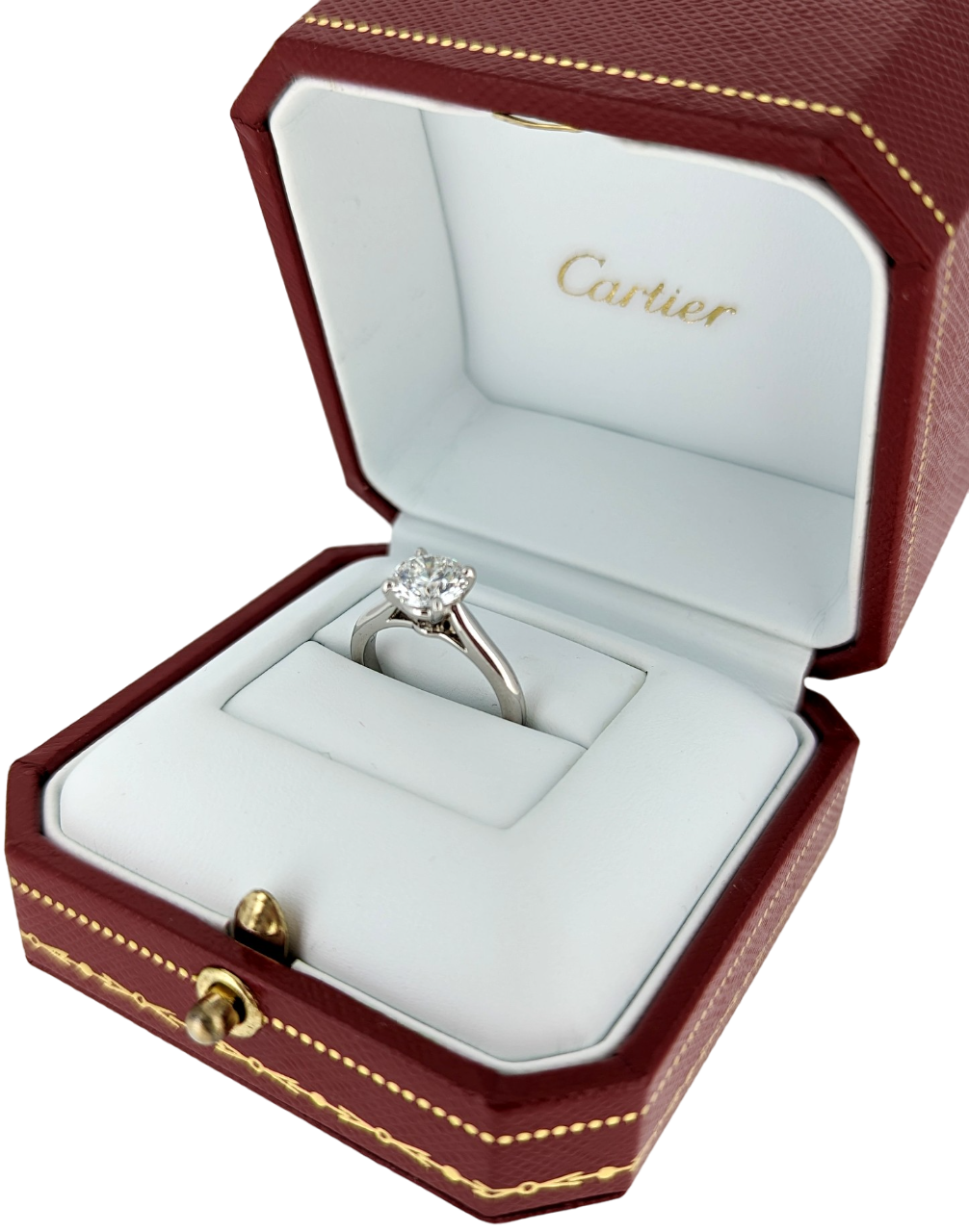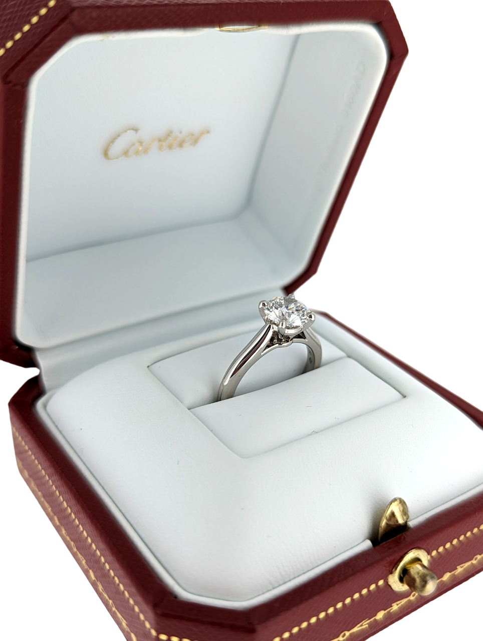 This platinum Cartier ring features a 1.22 carat round natural diamond with E color and VVS2 clarity. The cut, polish, and symmetry are all excellent, and it comes with the original inner and outer box as well as a GIA certificate. It is currently a size 4 but can be resized to fit.